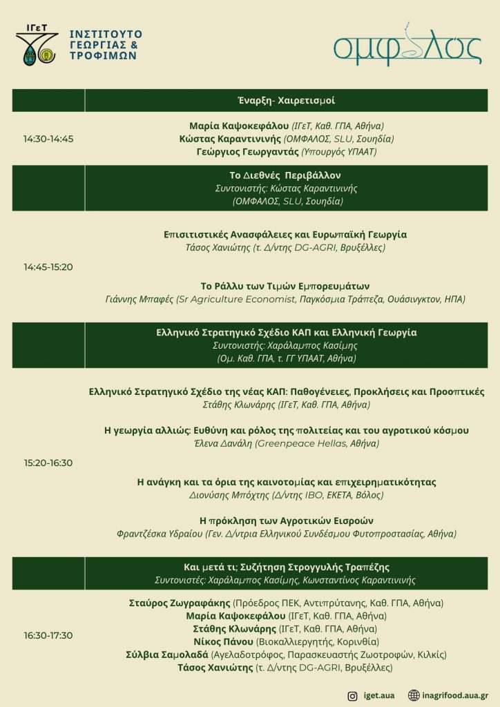 Η ημερίδα είναι αφιερωμένη στα φλέγοντα ζητήματα των ημερών και φέρνει γύρω από το τραπέζι ειδικούς από την Ελλάδα και το εξωτερικό μαζί με παραγωγικούς φορείς της χωράς για να συζητήσουν την νέα ΚΑΠ, την επισιτιστική κρίση και τον στρατηγικό σχεδιασμό της χώρας.