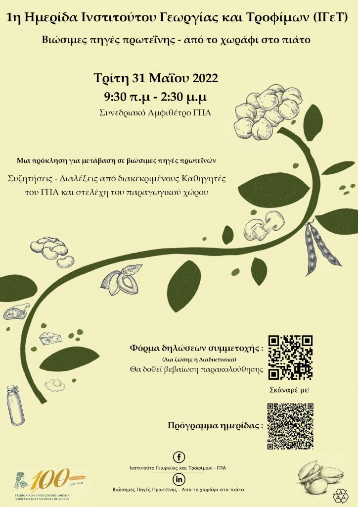 Εναλλακτικές πηγές πρωτεΐνης- Από το χωράφι στο πιάτο Στις 31 Μαϊου 2022, το ΙΓεΤ άνοιξε τις πόρτες του στην κοινότητα του Γεωπονικού Πανεπιστημίου Αθηνών και εγκαινίασε την δράση του με μια ημερίδα αφιερωμένη στην βιωσιμότητα και ειδικότερα στην πρόκληση για μετάβαση σε βιώσιμες πηγές πρωτεϊνών. Η ημερίδα περιελάμβανε διαλέξεις και συζητήσεις από διακεκριμένους Καθηγητές του ΓΠΑ και […]